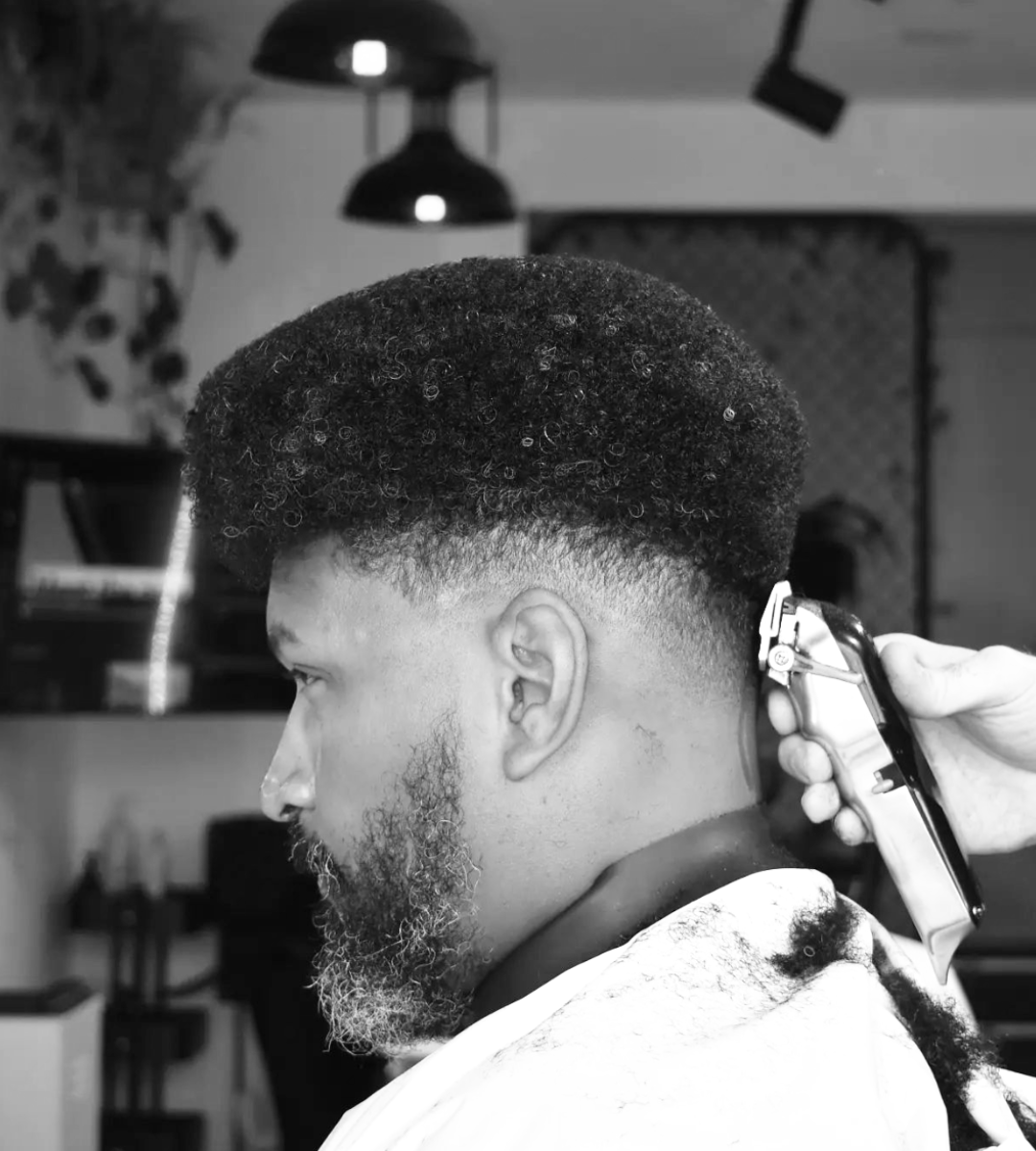 The cut focuses on enhancing the natural curls or coils while maintaining a sharp, clean look that complements the client’s face shape and style preferences. Afro cuts may also include fades or tapered sides for a modern finish.